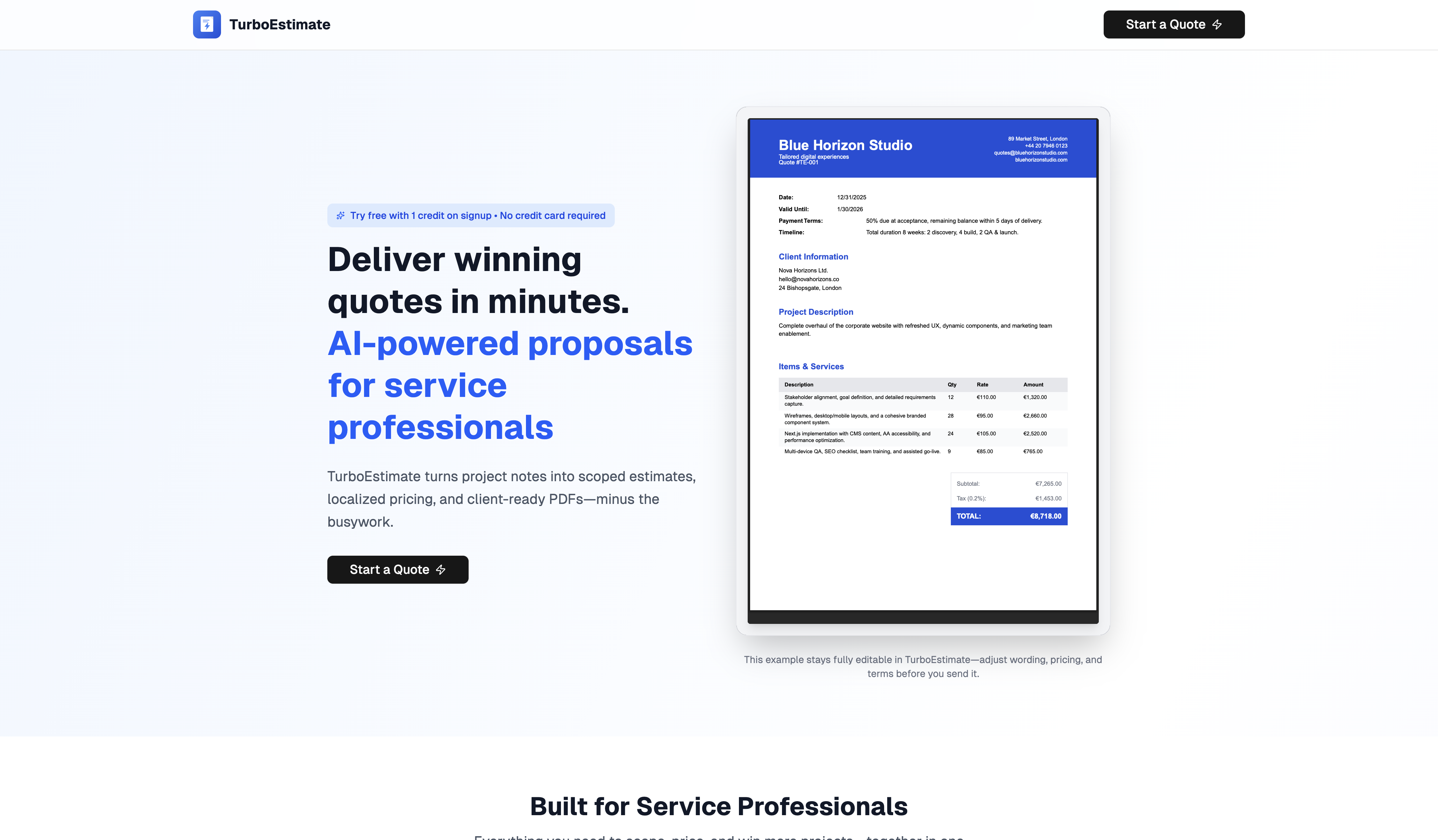 Creating accurate, professional quotes and estimates manually is time-consuming and error-prone for service professionals.